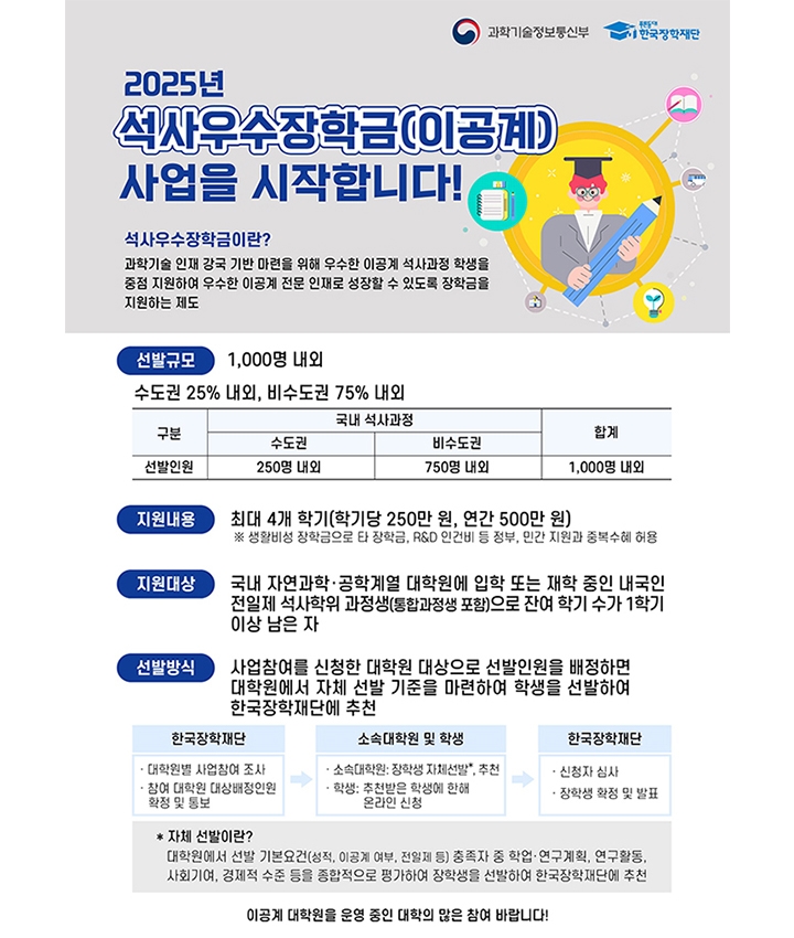 과학기술정보통신부와 한국장학재단은 '2025년도 이공계 석사우수장학금 장학사업'을 올해 처음 시행한다고 22일 밝혔다. '이공계 석사우수장학금'은 사업 참여 신청을 한 대학원의 소속 학생 중 장학생을 선발하며, 대학원 사업 참여 신청 기간은 내달 2일까지다. 이번 사업은 경력 초기 단계의 석사학위 과정생을 중점 지원해